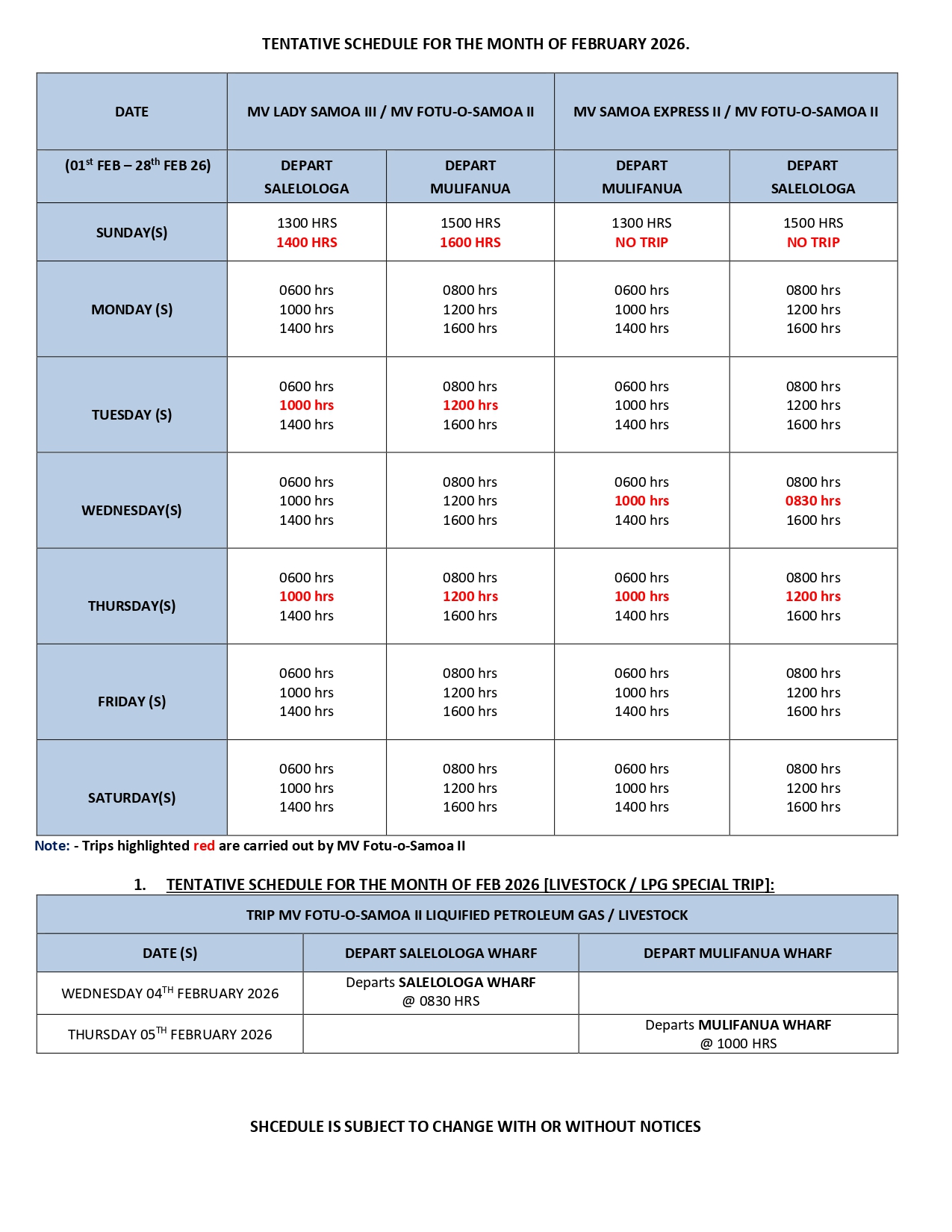Penalty Fee Apply when you miss your scheduled ferry sailing if you change existing confirmed dates and times of travel or vehicle type that is scheduled for sailing with us when traveling Domestic Route Mulifanua – Salelologa.
