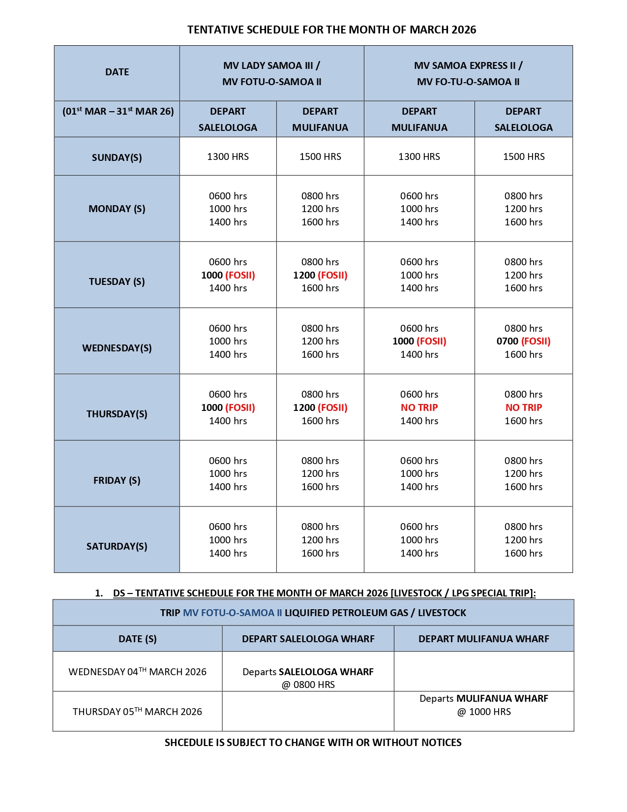 SAILING SCHEDULE FOR THE MONTH OF MARCH 2026